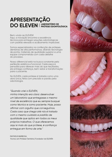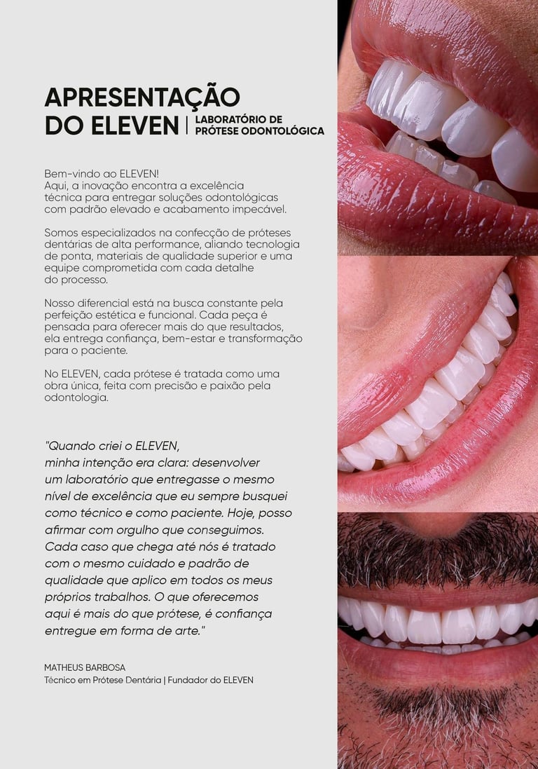 “Quando criei o ELEVEN, minha intenção era clara: desenvolver um laboratório que entregasse o mesmo nível de excelência que eu sempre busquei como técnico e como paciente. Hoje, posso afirmar com orgulho que conseguimos. Cada caso que chega até nós é tratado com o mesmo cuidado e padrão de qualidade que aplico em todos os meus próprios trabalhos. O que oferecemos aqui é mais do que prótese, é confiança entregue em forma de arte.”